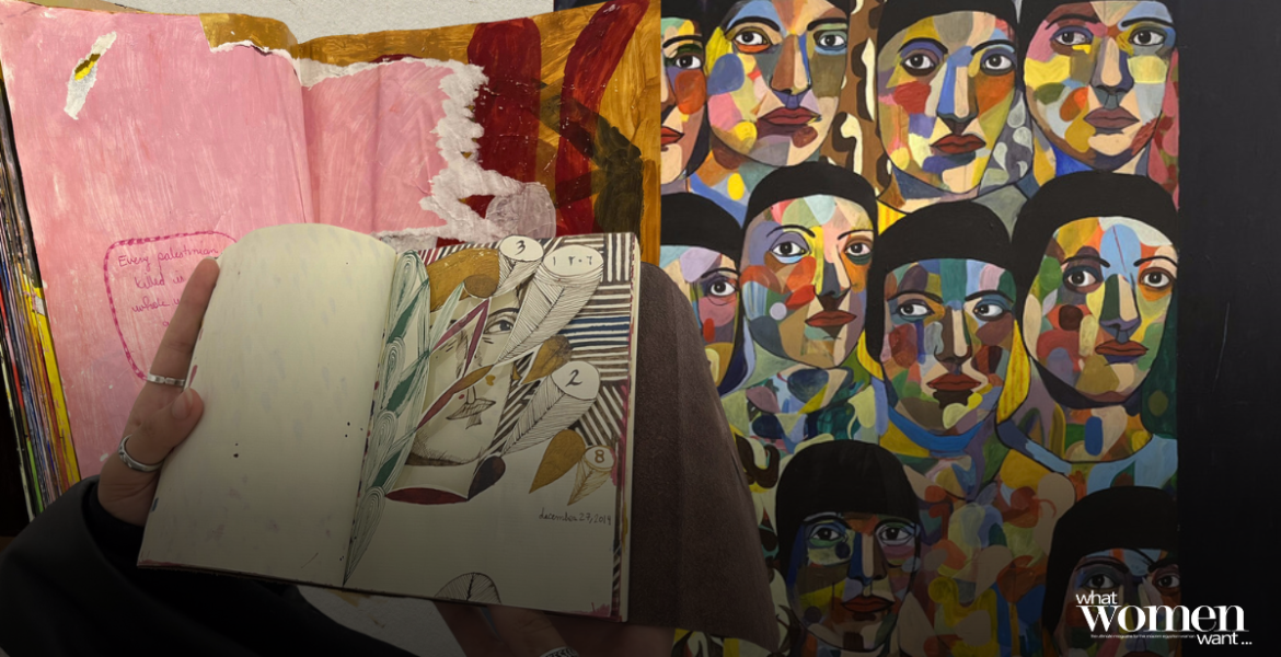 One of the installations in Metro 23 | Half-tales from a moving train is a wall of sketchbooks filled with Alkandari paintings. Each one is dedicated to one of the metro stations that she takes into the city. The visitors are encouraged to interact with it and flip through the pages. As you flip through the pages, you are transported into her world. For instance, “Every Palestinian killed is a while universe gone” is one of the many heart-wrenching pieces in the sketchbooks.